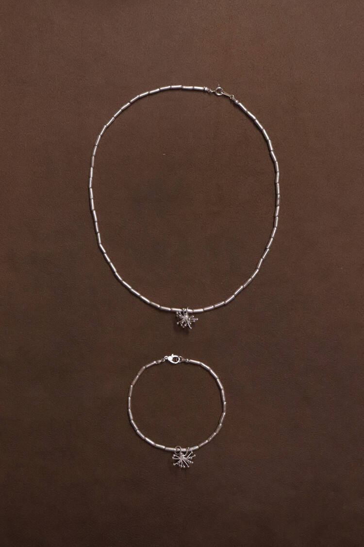 '민들레 홀씨' 가 연상되는 아름다운 펜던트가 달린 브레이슬렛으로, 기다란 원통 목걸이 줄이 독특한 제품입니다. 줄은 왁스 줄을 사용했으며, 원통 피스들이 줄에 꿰어있는 형태입니다.