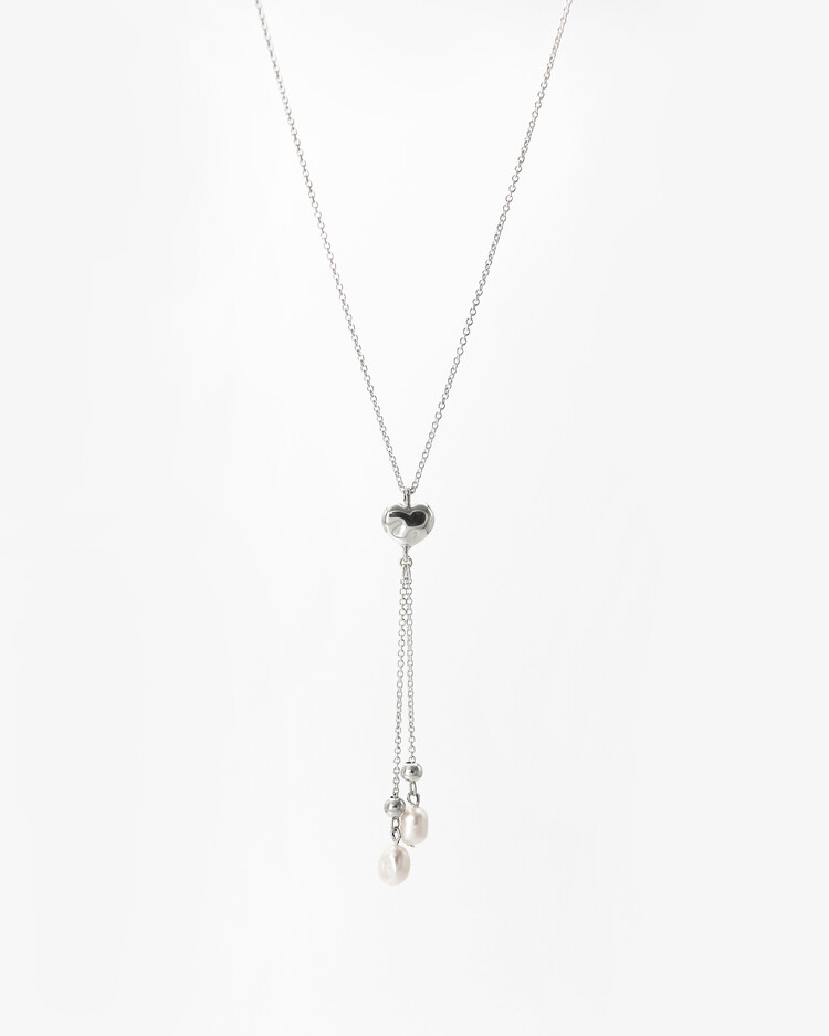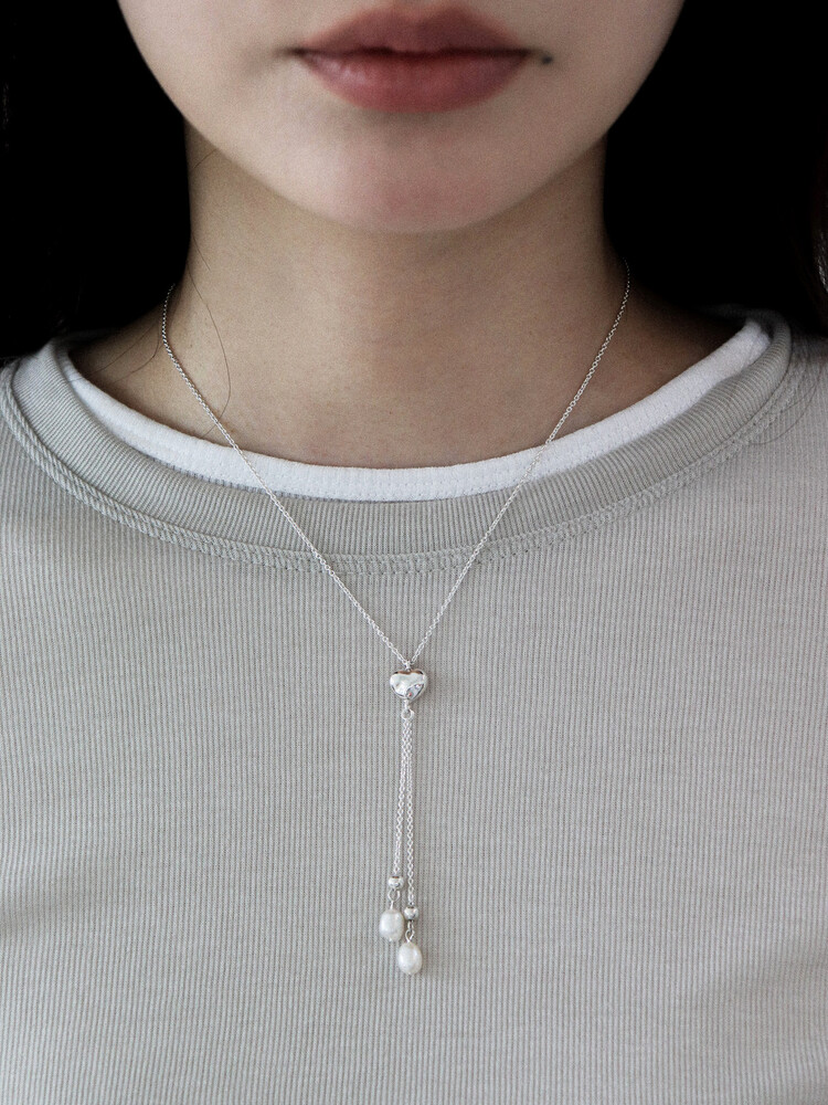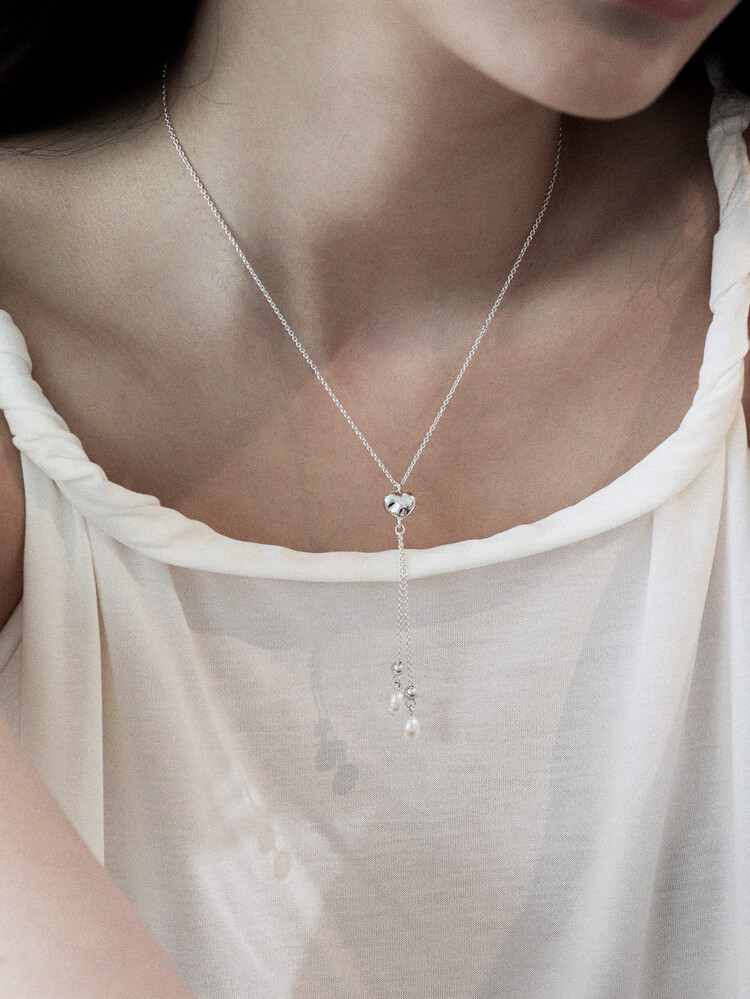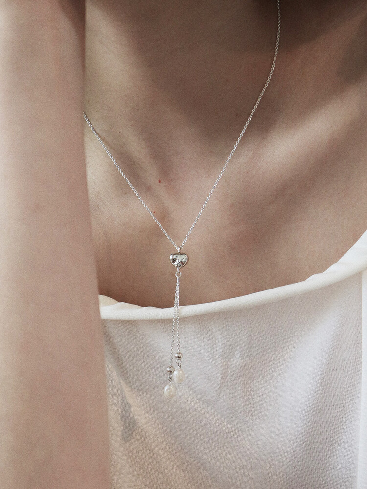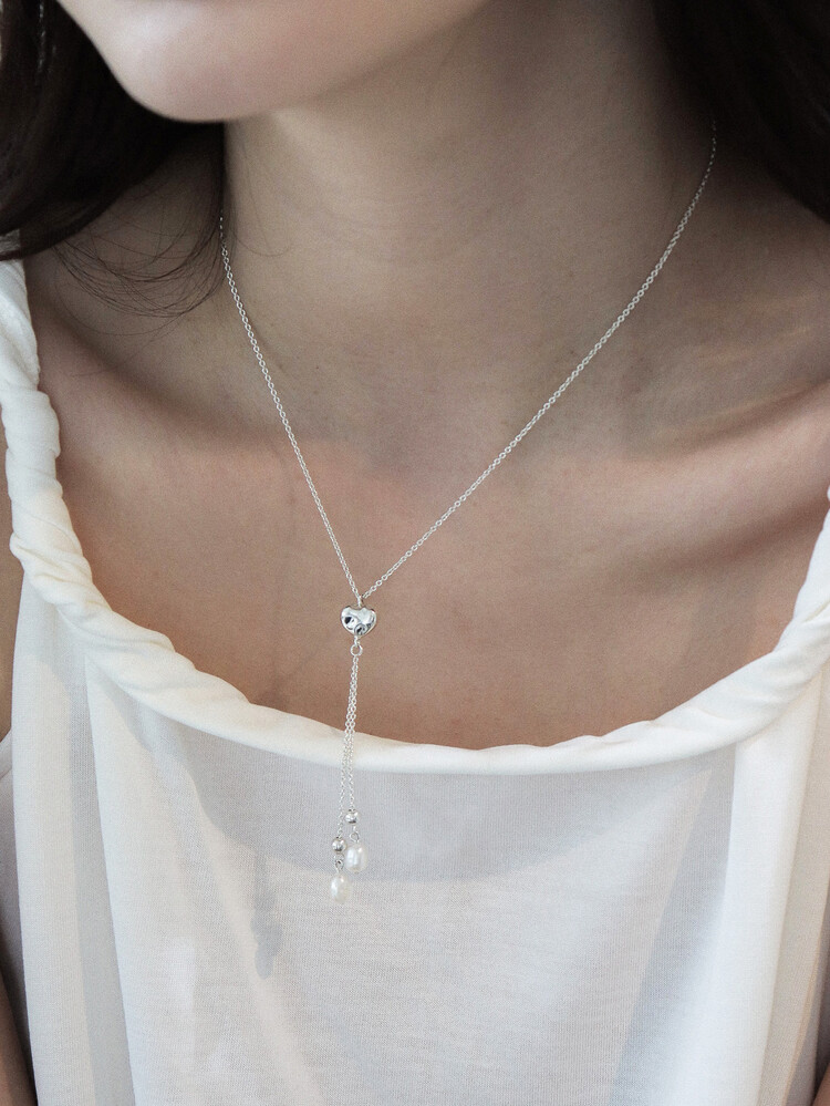 울퉁불퉁한 하트 모양에 드롭 형태의 진주가 달린 y자형 목걸이입니다.