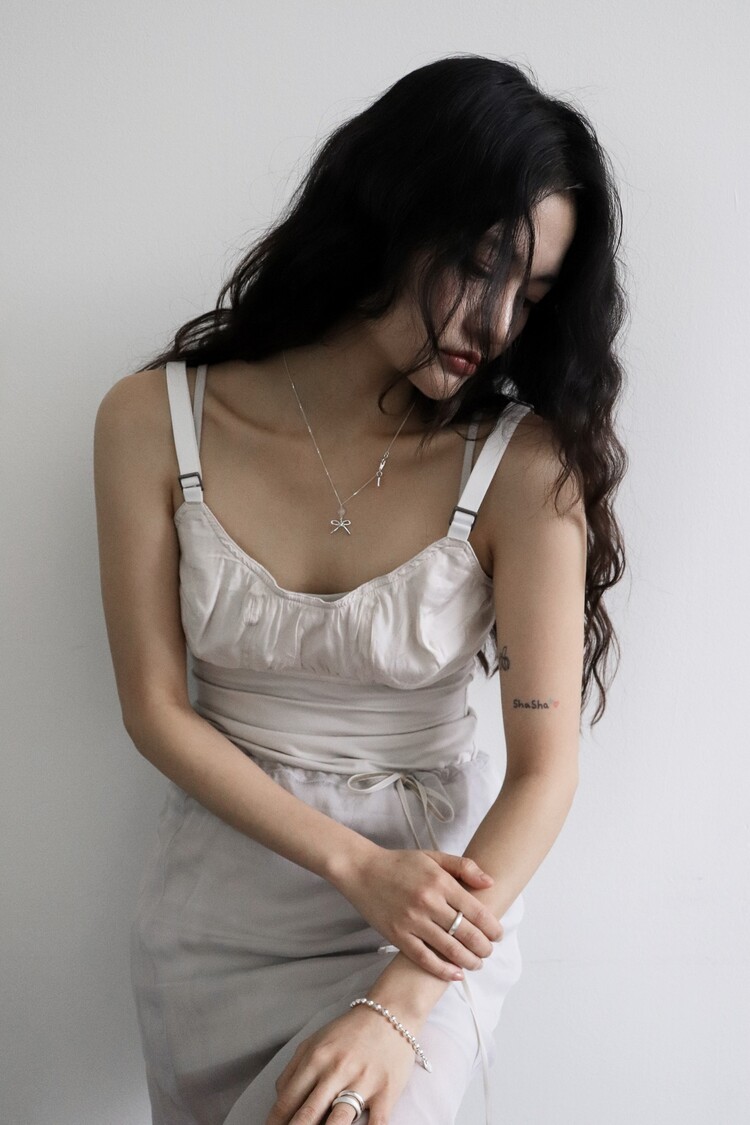 발레 코어에서 영감을 얻은 리본과 천연 장미석 볼의 조화가 아름다운 목걸이입니다.
